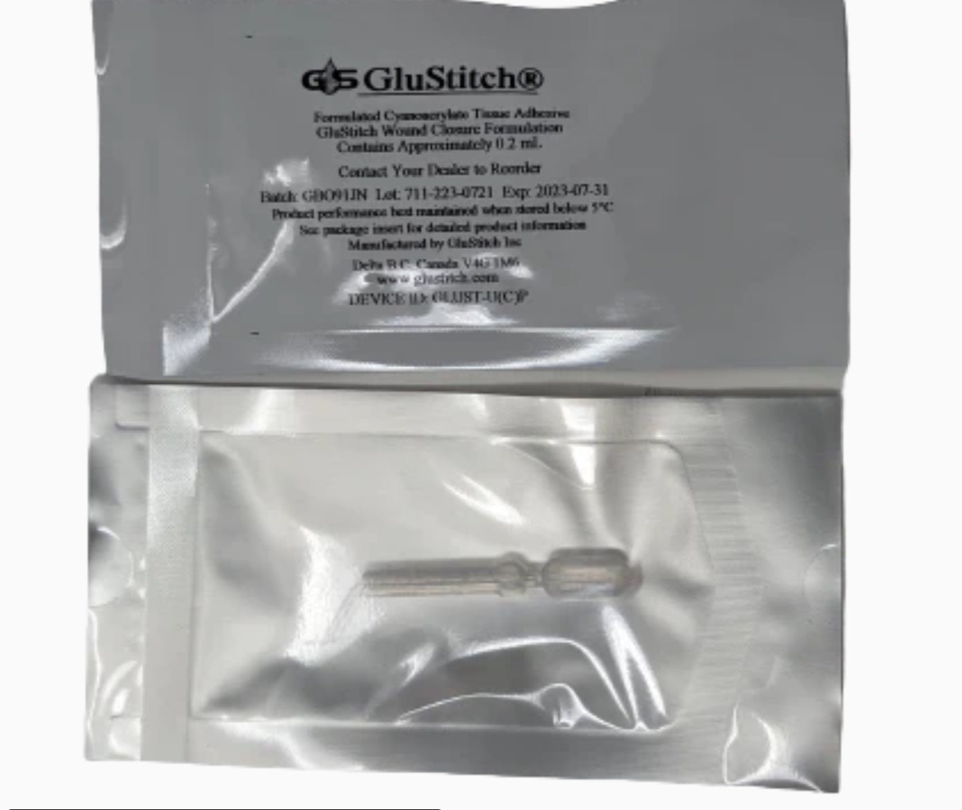 GluStitch® est un adhésif tissulaire à base de cyanoacrylate, formulé pour la fermeture des bandages. Indiqué pour les lacérations cutanées simples avec peu ou pas de perte de tissu, il fonctionne en complément des stéri-strips ou leukostrips, aidant à maintenir la zone fermée lorsqu'il n'y a pas de grande perte de peau. Chaque sachet stérile contient 0,2 ml de cyanoacrylate médical, avec une formulation à séchage rapide qui s'assèche pour former une finition lisse et flexible, épousant les contours des tissus. Son système de délivrance conviviale est approuvé par Santé Canada. Toutefois, il est important de ne pas l'utiliser en cas de plaie contaminée, de morsure d'animal, de blessure par perforation ou d'écrasement, ou de blessure irrégulièrement difficile à rapprocher, et ne doit pas être appliqué près des yeux.